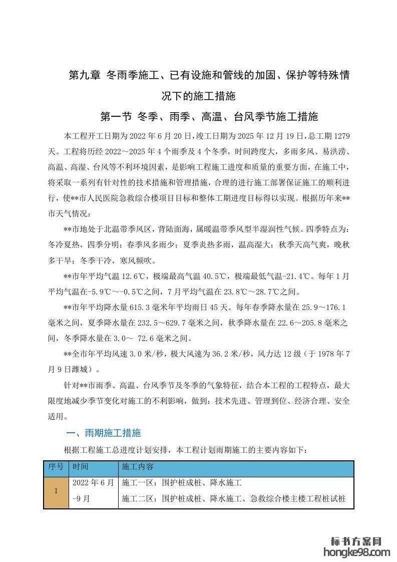 标题:医院急救综合楼工程项目冬雨季施工、已有设施、管线的加固、保护等特殊情况下的施工措施(49页)