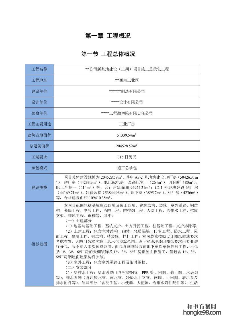标题:生产基地建设项目施工总承包工程技术标(421页)