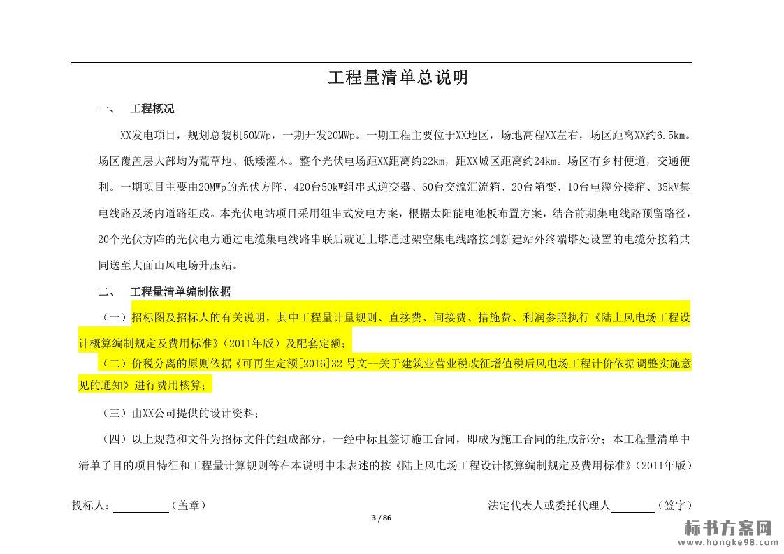 标题:20MWp光伏项目工程量清单编制说明及清单格式(86页)