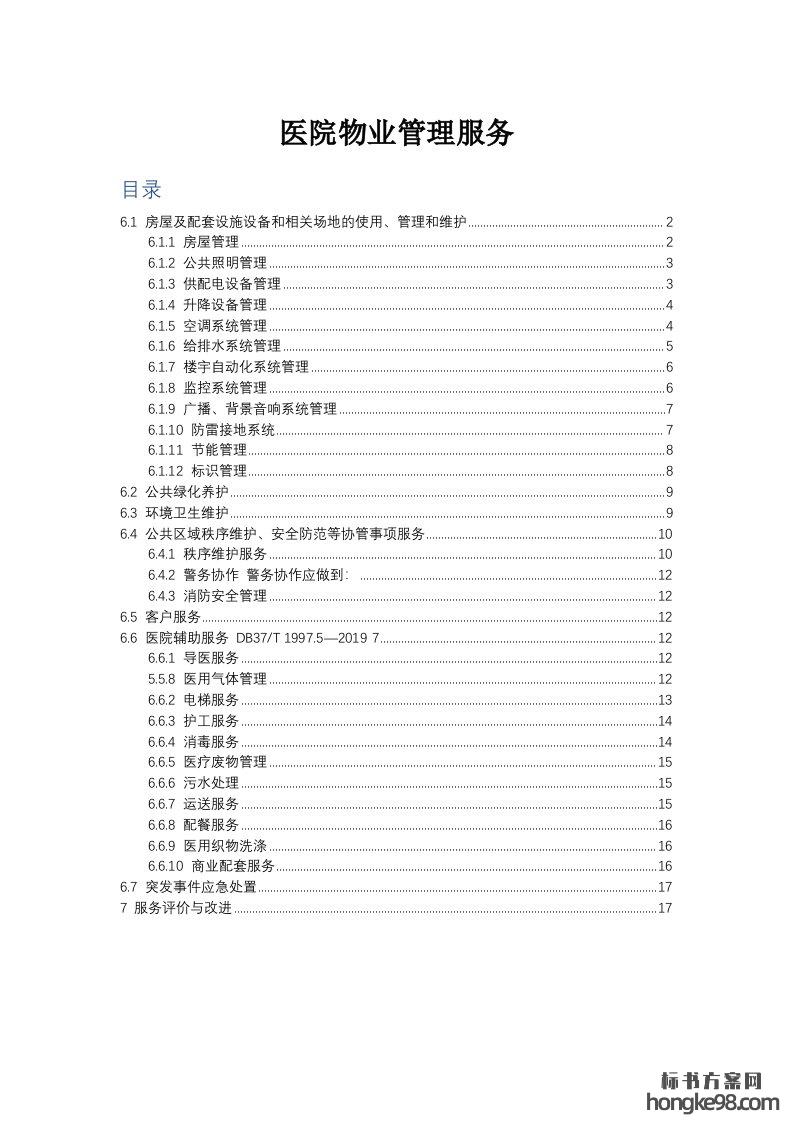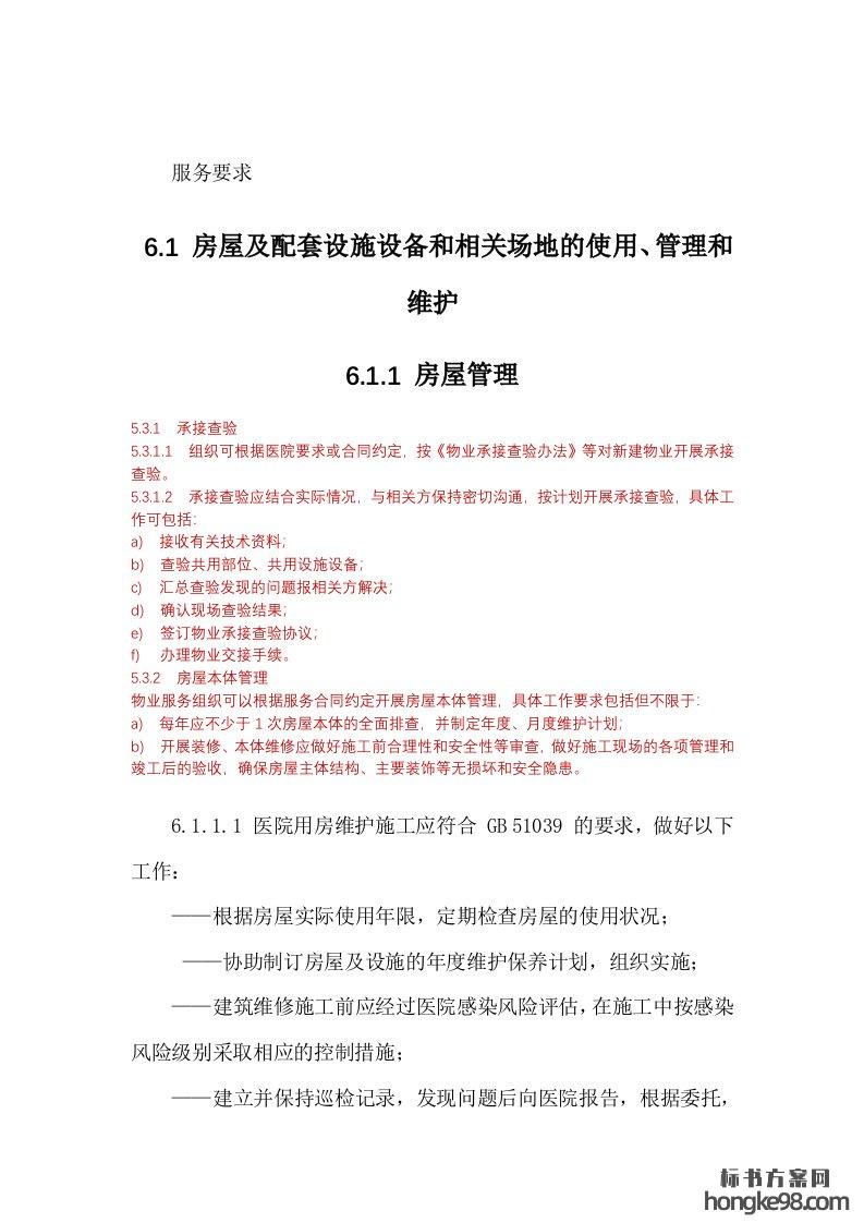 本方案依据最新的《医院物业管理服务规范》等规定编制。方案包括:房屋及配套设施设备和相关场地的使用、管理和维护方案、公共绿化养护方案、环境卫生维护方案、公共区域秩序维护、安全防范等协管事项服务方案、客户服务方案、医院辅助服务方案、突发事件应急处置方案、服务评价与改进方案等方面内容,满足医院物业管理服务招标要求。 WORD格式,文件目录、索引清晰,字体统一,图表可编辑,排版完整,章、节分明,文字排版具有一定的审美,内容针对性强,具备专业性,清晰无水印,可直接添加投标人名称简单编排即可。 特别提醒:请在编制时依据项目实际情况,调整内容。